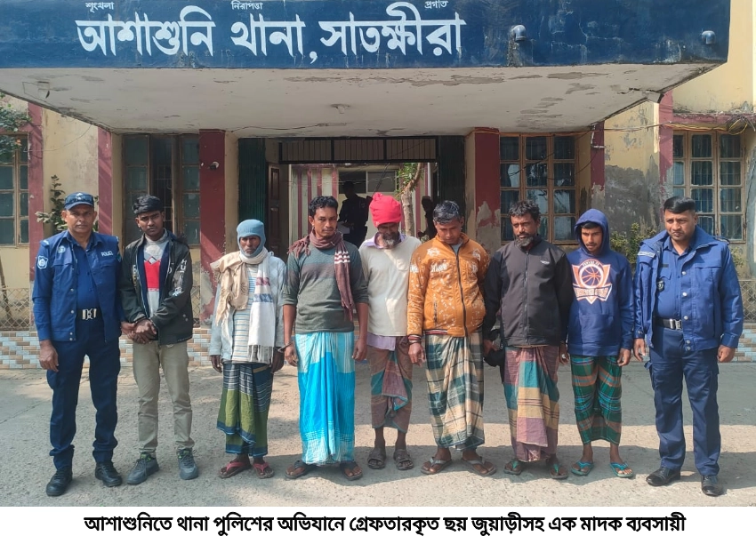 মঙ্গলবার (২০ জানুয়ারী) দিবাগত গভীর রাতে আশাশুনি থানার অফিসার ইনচার্জ শামীম আহমদ খান নিজে ও থানার সেকেন্ড অফিসার এসআই রাশেদুজ্জামান অভিযান চালিয়ে উপজেলার শোভনালী ইউনিয়নের মোঃ আশরাফুল এর চায়ের দোকান থেকে বৈকরঝুটি গ্রামের মৃত কৃষ্ণপদ সরকারের ছেলে প্রশান্ত সরকার (৫৬), মৃত কোমল কৃষ্ণ সরকারের ছেলে মানিক সরকার (৪৬), ফজর আলী গাজীর ছেলে আবু হাসান গাজী (৪২), আঃ গফুর সরদারের ছেলে সেলিম রেজা (৩২), শোভনালী গ্রামের মৃত সোহেল উদ্দিন সরদারের ছেলে মুজিবর সরদার (৫৬) ও মৃত জামাল উদ্দিন সরদারের ছেলে আকবর আলী (৪৭)কে গ্রেফতার করেন।