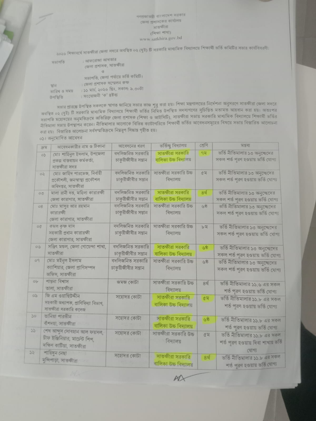 আবেদনগুলো নিয়ে গত ১১ মার্চ জেলা প্রশাসকের সভাপতিত্বে ভর্তি কমিটির সভা অনুষ্ঠিত হয়। সভায় অতিরিক্ত জেলা প্রশাসক (শিক্ষা ও আইসিটি) স্কুলে ভর্তির নীতিমালা উপস্থাপন করেন। প্রাপ্ত আবেদনগুলো যাচাই-বাছাই করে ১৩ জনকে সাতক্ষীরা শহরের সরকারি দুই স্কুলে ভর্তির জন্য সুপারিশ করা হয়। এর মধ্যে সরকারি বালিকা উচ্চ বিদ্যালয়ে ৬ জন, বাকী ৭ জন সরকারি উচ্চ বিদ্যালয়ে। প্রত্যেক আবেদনকারীর সকল তথ্য ও উপাত্ত এবং সভার রেজুলেশন স্কুলে পাঠানো হয়। আবেদনের নামের পাশে কোন ক্যাটাগরিতে শিক্ষার্থীকে ভর্তির সুযোগ দেয়া হয়েছে তাও উল্লেখ করা হয়। কিন্তু সভার একমাস অতিবাহিত হলেও সাতক্ষীরা সরকারি বালিকা উচ্চ বিদ্যালয়ে কোন শিক্ষার্থীকে এখনও ভর্তি করানো হয় নি। এমনকি কোন শিক্ষার্থীর অবিভাবকের সাথে যোগাযোগও করা হয়নি। কেউ কেউ যোগাযোগ করলে তাদেরকে বিভিন্নভাবে হয়রানি করা হচ্ছে।
