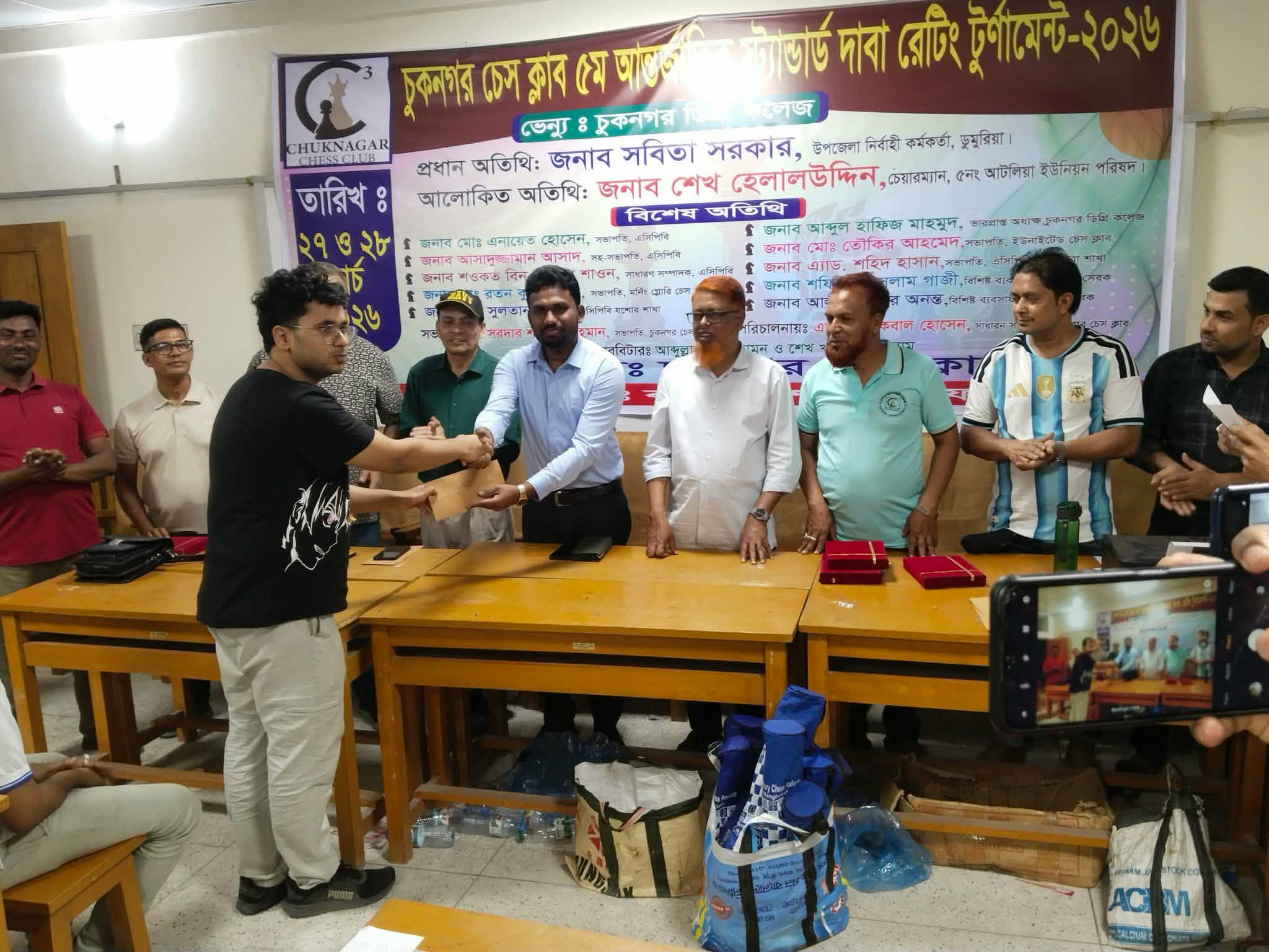 শনিবার সন্ধ্যায় ডুমুরিয়ার চুকনগর ডিগ্রী কলেজের চতুর্থ তলায় সরদার শাইদুল ইসলামের সভাপতিত্বে সাংবাদিক দীপ্তিমান বাপ্পীর আয়োজনে এ দাবা প্রতিযোগিতার পুরষ্কার বিতরণী অনুষ্ঠানের প্রধান অতিথি ছিলেন সহকারী কমিশনার (ভূমি) অমিত কুমার বিশ্বাস। বিশেষ অতিথি ছিলেন এসিপিব‘র সভাপতি মোঃ এনায়েত হোসেন, সহ-সভাপতি মোঃ আসাদুজ্জামান আসাদ, মোঃ টিপু সুলতান, আব্দুল হাফিজ মাহমুদ, শেখ খায়রুল ইসলাম, শফিকুল ইসলাম গাজী প্রমুখ।