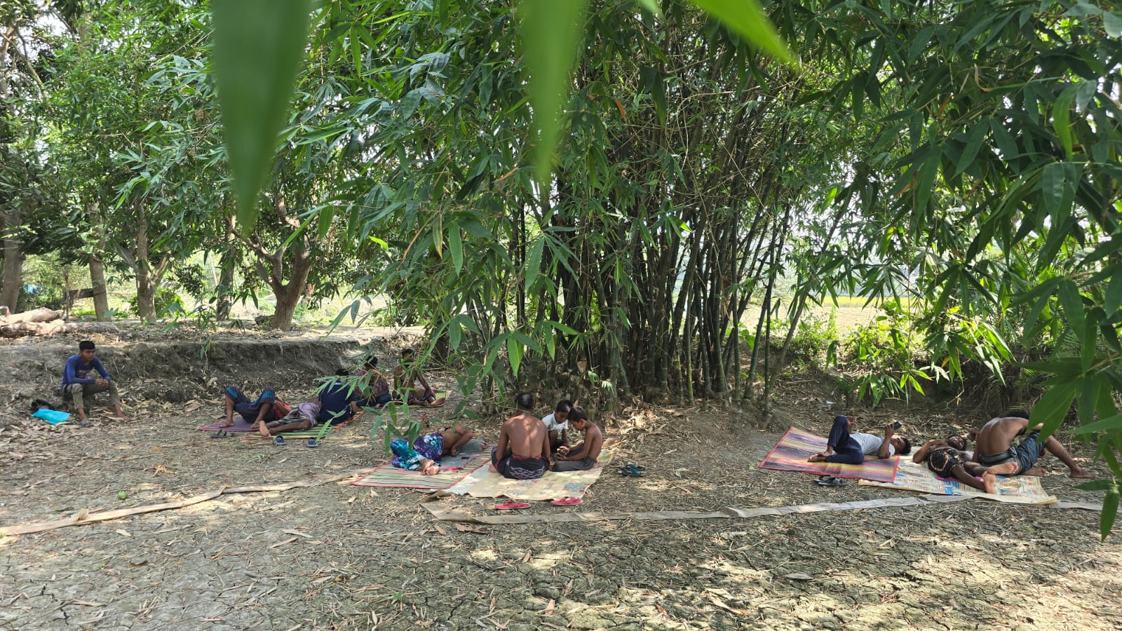 বৃহস্পতিবার দুপুরে সাতক্ষীরা সদর উপজেলার বকচরা গ্রামের একটি বাঁশ বাগানে শিশু-কিশোর থেকে শুরু কওে বয়স্করাও পাটি বা চাটাই বিছিয়ে বিশ্রাম নিতে দেখা যায়।
