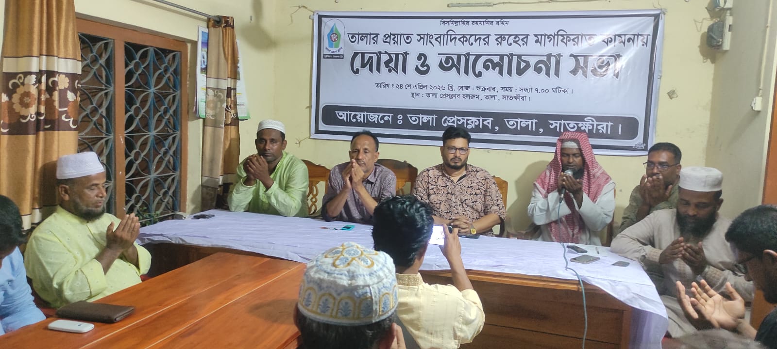 আলোচনা সভা শেষে মরহুম সাংবাদিকদের আত্মার শান্তি ও মাগফিরাত কামনা করে বিশেষ দোয়া ও মোনাজাত পরিচালনা করেন তালা উপজেলা মডেল মসজিদের পেশ ইমাম মাওলানা তাওহিদুর রহমান।এসময় উপস্থিত ছিলেন তালা প্রেসক্লাবের সহ-সভাপতি আসাদুজ্জামান রাজু, খলিলুর রহমান লিথু, সহ-সম্পাদক মোহাম্মদ ইলিয়াস হোসেন, সংগঠনিক সম্পাদক জাহাঙ্গীর হোসেন, সহ সংগঠনিক সম্পাদক মোঃ তরিকুল ইসলাম, অর্থ সম্পাদক মোতাহিরুল হক শাহিন, দপ্তর সম্পাদক শফিকুল ইসলাম, প্রচার সম্পাদক সেকেন্দার আবু জাফর বাবু, ক্রীড়া সম্পাদক কাজী লিয়াকত হোসেন, নির্বাহী সদস্য কেএম শাহিনুর রহমান, এস এম নাহিদ হাসান, আজিজুর রহমান, জয়দেব চক্রবর্তী, ইমরান হোসেন, শেখ বিল্লাল হোসেন, সৈয়দ মারুফ হোসেন, কামাল হোসেন, কাজি হিল্লোল, তাপস সরকার, সুমন রায় গণেষ, রফিকুল ইসলাম নয়ন সহ সুধীজন এবং গণ্যমান্য ব্যক্তিবর্গ এসময় উপস্থিত ছিলেন।