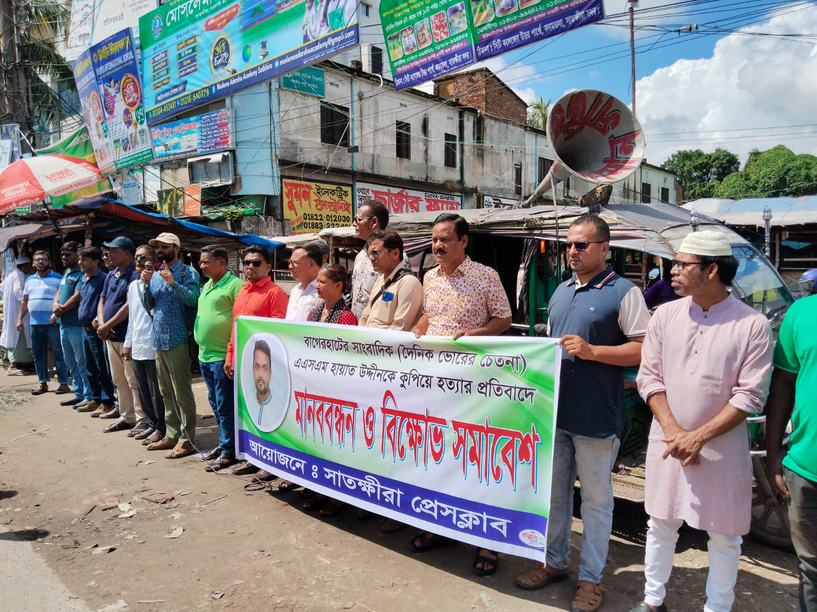 নিজস্ব প্রতিনিধি: বাগেরহাটের সাংবাদিক এএসএম হায়াত উদ্দীনকে কুপিয়ে হত্যার প্রতিবাদে সাতক্ষীরায় মানববন্ধন করেছেন সাংবাদিকরা।