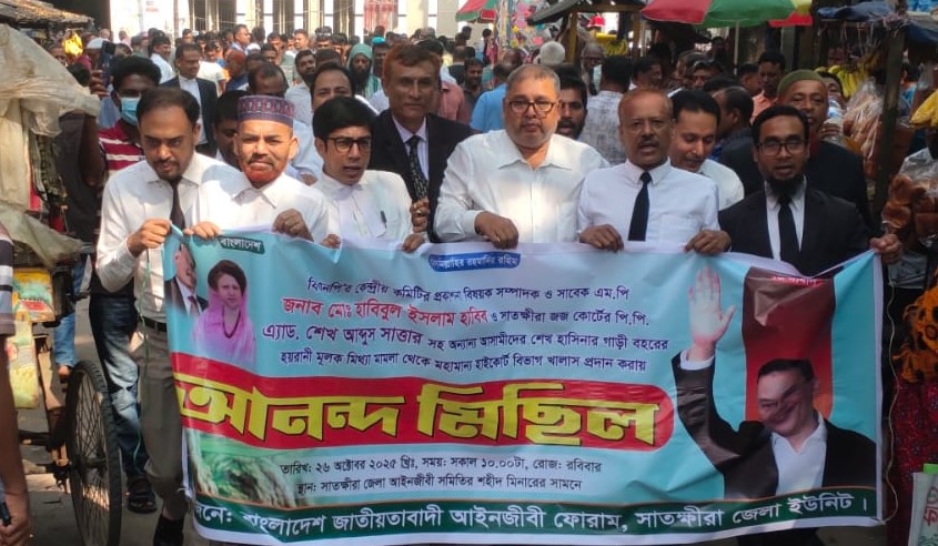 সাতক্ষীরা জেলা জাতীয়তাবাদী আইনজীবী ফোরামের আয়োজনে রবিবার সকালে আইনজীবী সমিতির শহীদ মিনারের সামনে থেকে মিছিলটি বের হয়। মিছিলটি কোর্ট চত্বর এলাকার সড়ক প্রদক্ষিণ শেষে শহীদ মিনার চত্বরে আলোচনা সভায় মিলিত হয়।