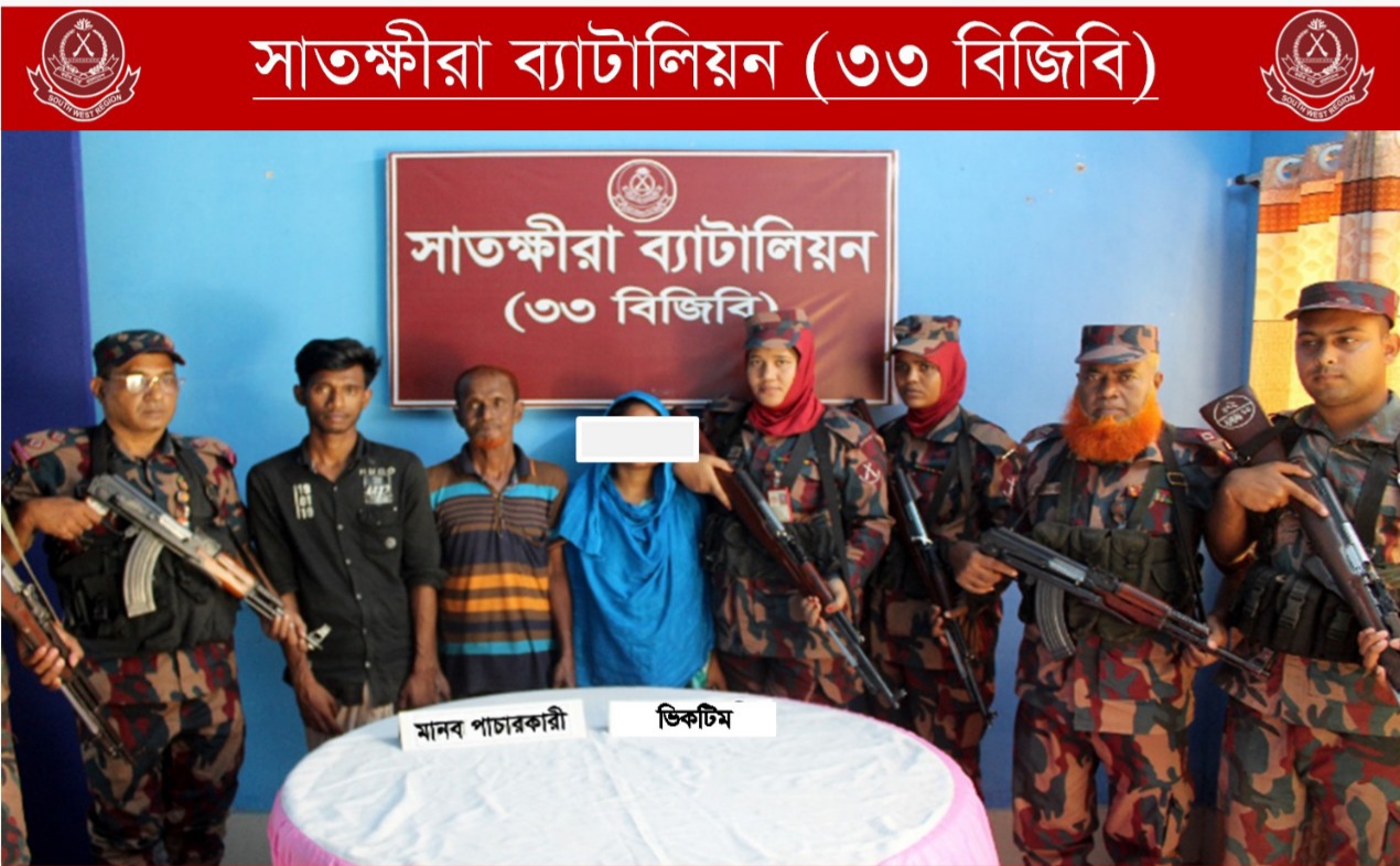 বিজিবি জানায়, সাতক্ষীরার তলুইগাছা সীমান্ত দিয়ে এক বাংলাদেশী নারীকে ভারতে পাচার করা হচ্ছে এমন গোপন সংবাদের ভিত্তিতে বিজিবি ৩৩ ব্যাটেলিয়নের একটি আভিযানিকদল তলুইগাছা সীমান্তের মেইন পিলার ৩ ও সাবপিলার ১৩ হতে আনুমানিক ৩ কিলোমিটার বাংলাদেশের অভ্যন্তরে কুলিয়াডাঙ্গা নামক স্থানে অভিযান চালিয়ে পাচারকারী পিতা-পুত্র আবুল কালাম ও ইমরান হোসেনকে গ্রেপ্তার করে। এসময় তাদের স্বীকারোক্তি মোতাবেক তাদের বাড়ি থেকে সেতু আক্তার নামের ওই নারীকে উদ্ধার করা হয়।