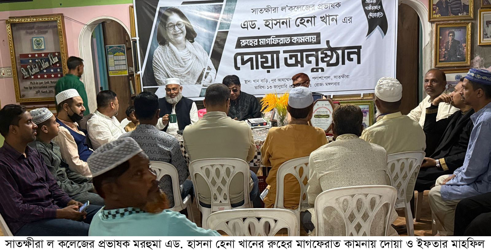 ইফতার মাহফিলে উপস্থিত সবাই সাতক্ষীরা ল কলেজের প্রভাষক মরহুমা এড. হাসনা হেনা খানের কর্মময় জীবনের বিভিন্ন দিকের ওপর আলোচনা করেন এবং রুহের মাগফেরাত কামনার পাশা পাশি শোকসন্তপ্ত পরিবারের প্রতি গভীর সমবেদনা ব্যক্ত করেন। দোয়া ও ইফতার মাহফিলে রাজনৈতিক ব্যক্তিবর্গ, আইনজীবী, আত্মীয়-স্বজন, শুভাকাঙ্খী, স্থানীয় এলাকাবাসী ও মসজিদের মুসুল্লীরা উপস্থিত ছিলেন।