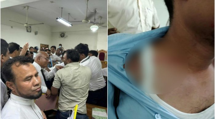 অনলাইন ডেস্ক: কোর্ট চলাকালীন সময় এজলাসে বিচারক উপস্থিত অবস্থাতেই আইনজীবীদের মারধরে রক্তাক্ত জখম হয়েছেন এক সাংবাদিক। বৃহস্পতবিার (৪ সেপ্টেম্বর) বিকেলে ঢাকার মেট্রোপলিটন ম্যাজিস্ট্রেট হাসিব উল্লাস পিয়াসের আদালতে এ ঘটনা ঘটে।