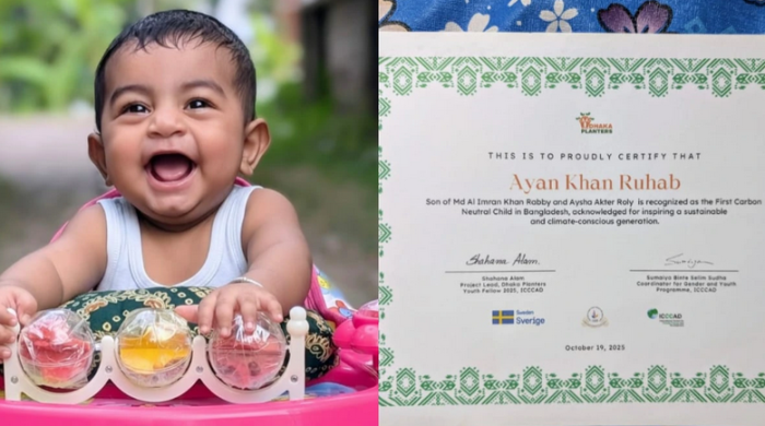 তালা (সাতক্ষীরা) প্রতিনিধি: বাংলাদেশের প্রথম কার্বন-নিউট্রাল শিশু হিসেবে স্বীকৃতি পেয়েছে সাতক্ষীরার শিশু আয়ান খান রুহাব। মাত্র আট মাস বয়সেই রুহাব এই বিশেষ স্বীকৃতি পেয়ে খুশি সাতক্ষীরার মানুষজন। ইমরান রাব্বি ও