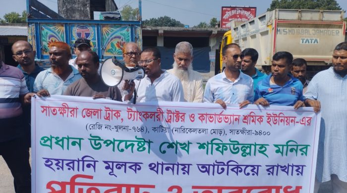 নিজস্ব প্রতিনিধি: সাতক্ষীরা জেলা ট্রাক, ট্যাংকলরি, ট্রাক্টর ও কাভার্ডভ্যান শ্রমিক ইউনিয়নের (রেজি: খুলনা-৭৬৪) প্রধান উপদেষ্টা শেখ শফিউল্লাহ মনিকে হয়রানিমূলকভাবে থানায় আটকে রাখার অভিযোগ এনে মানববন্ধন ও প্রতিবাদ কর্মসূচি পালন করেছেন বিস্তারিত