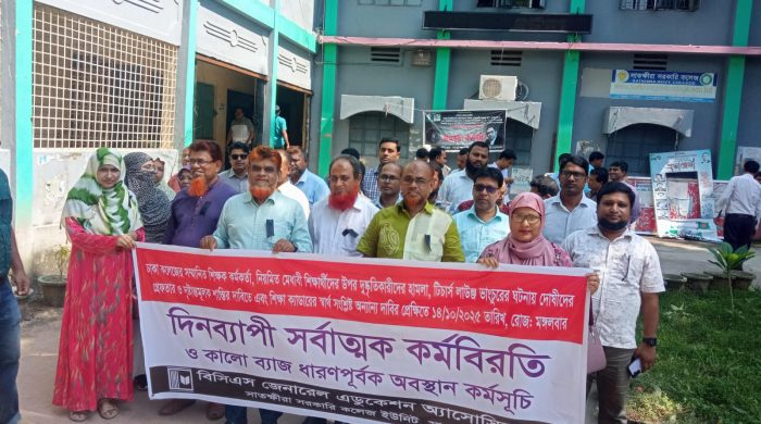 নিজস্ব প্রতিনিধি: ঢাকা কলেজে শিক্ষক লাঞ্ছনার ঘটনাকে কেন্দ্র করে সারাদেশের ন্যায় বিসিএস জেনারেল এডুকেশন অ্যাসোসিয়েশন সাতক্ষীরা সরকারি কলেজ ইউনিটের উদ্যোগে সর্বাত্মক কর্মবিরতি ও কালো ব্যাজ ধারণপূর্বক অবস্থান কর্মসূচি পালিত হয়েছে।