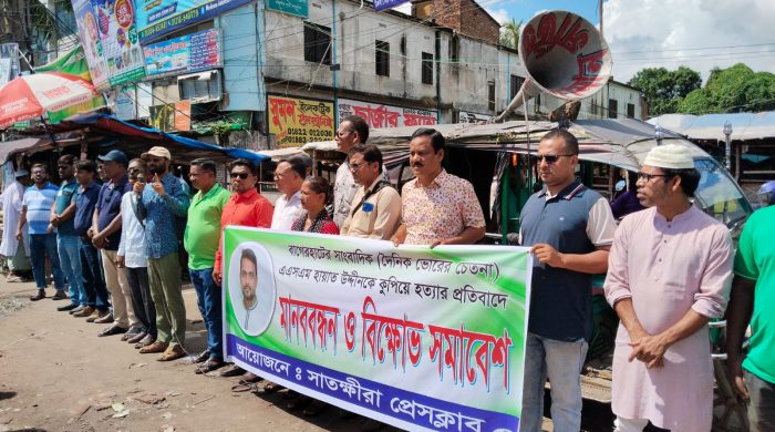 নিজস্ব প্রতিনিধি: বাগেরহাটের সাংবাদিক এএসএম হায়াত উদ্দীনকে কুপিয়ে হত্যার প্রতিবাদে সাতক্ষীরায় মানববন্ধন করেছেন সাংবাদিকরা। শনিবার (১১ অক্টোবর) সাতক্ষীরা শহরের নিউ মার্কেটের সামনে সাতক্ষীরা প্রেসক্লাবের আহবানে এ মানববন্ধন অনুষ্ঠিত হয়। মানববন্ধনে