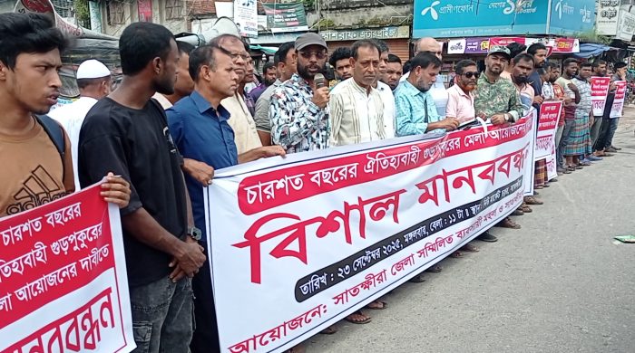 নিজস্ব প্রতিনিধি: সাতক্ষীরার চারশত বছরের ঐতিহ্য বহনকারী ঐতিহ্যবাহী গুড়পুকুরের মেলা আয়োজনের দাবীতে সাতক্ষীরায় মানববন্ধন অনুষ্ঠিত হয়েছে। মঙ্গলবার (২৩ সেপ্টেম্বর) সাতক্ষীরা নিউমার্কেটের সামনে জেলা সম্মিলিত ব্যবসায়ী মহল ও সাতক্ষীরাবাসীর আয়োজনে এ